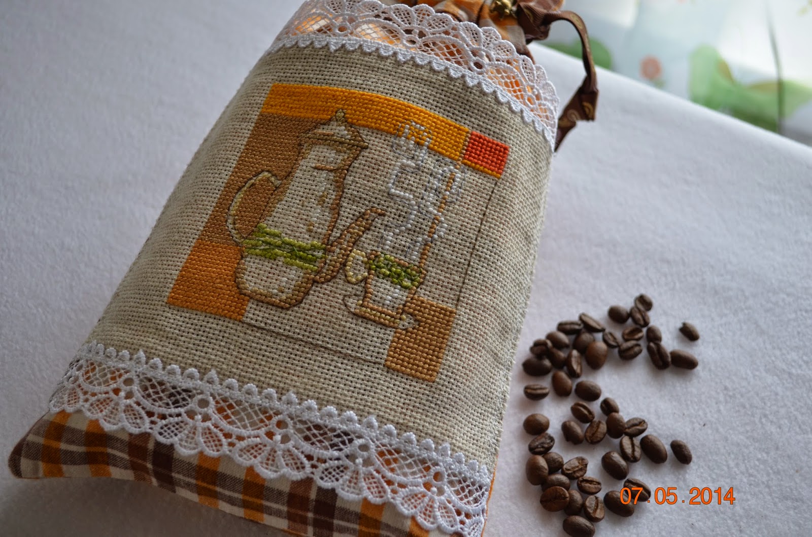Снова у меня появился кофейный мешочек. Вышивка давно ждала своего часа. Клетчатая ткань по моему хорошо сочетается с ниточками на вышивке. Добавила кружавчики и репсовую ленту, украсила подвесочкой в виде чайничка.